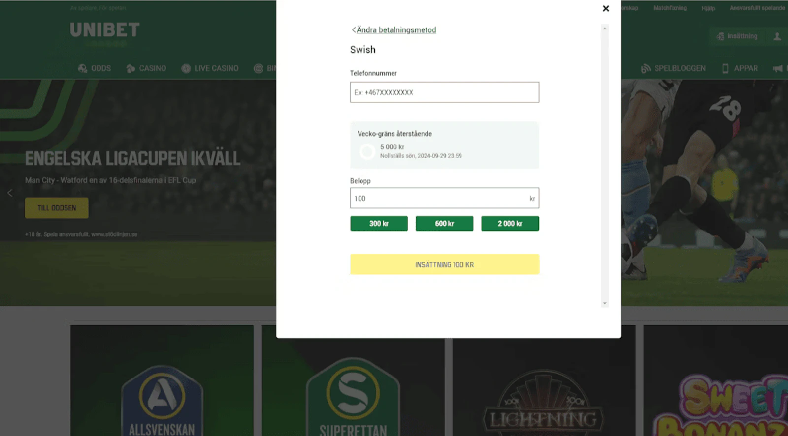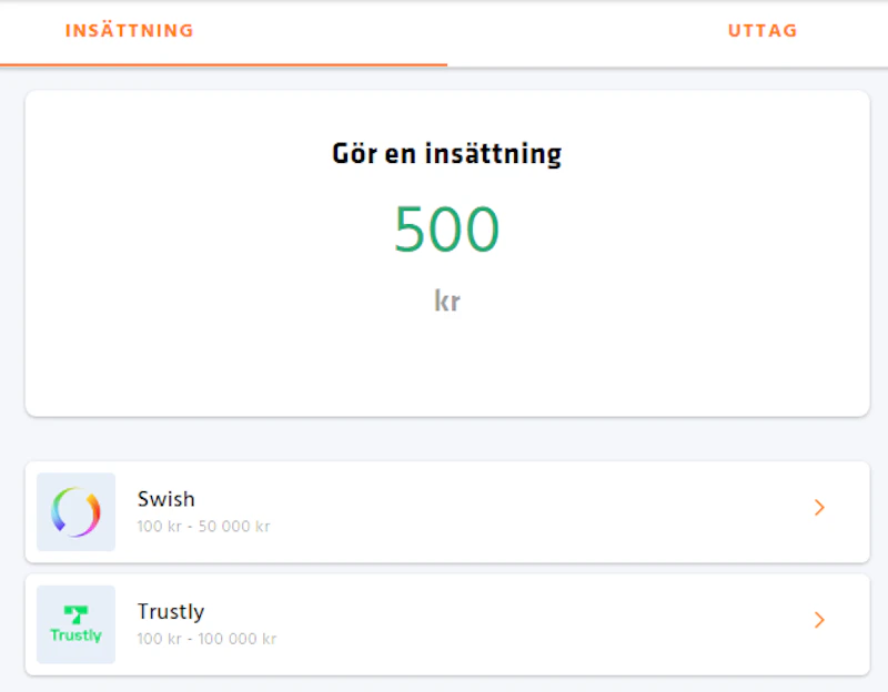 - Gör en insättning! Nu när du har skapat ett konto behöver du sätta in minst 50 kr för att få tillgång till livestreaming. Det gör du enkelt genom att klicka på "Insättning" uppe till höger på sidan. Då kommer du till insättningssidan, där du kan välja bland flera snabba och smidiga betalmetoder. Bet365 erbjuder bland annat Swish, Trustly och kontokort.