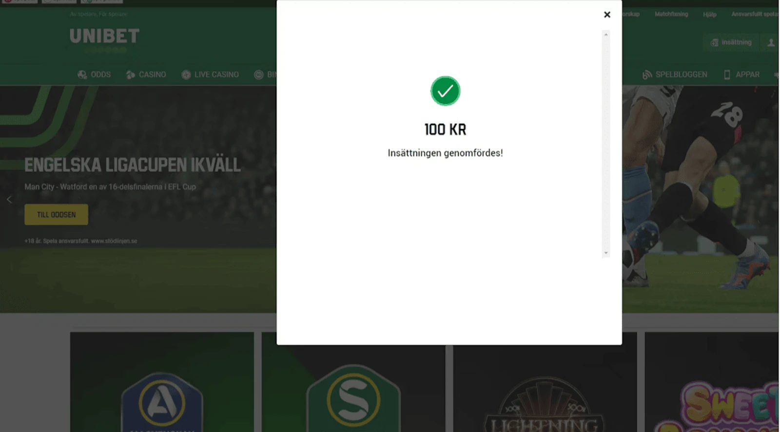 Minsta insats 50 kr och krav på 1x fastställt spel för att få spelkrediterna. Minsta odds, spel och betalningsmetod exkluderingar gäller. Utbetalningar exkluderar insatser i spelkrediter. Tidsbegränsningar och villkor tillämpas. | ||||||