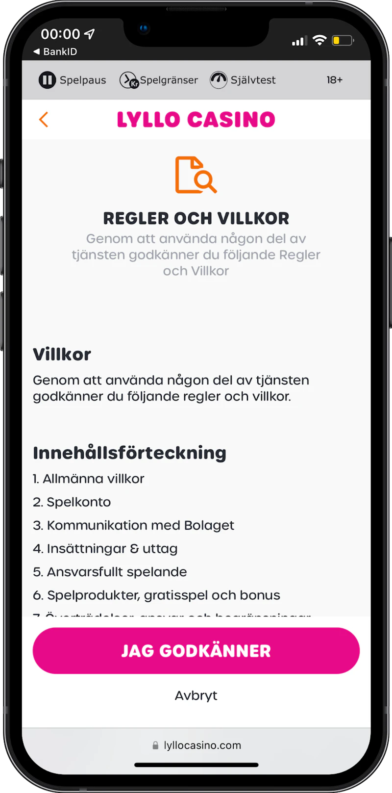 Godkänn regler och villkor hos Lyllo Casino för att ta dig till nästa steg. Ett tips är att alltid läsa igenom regler och villkor, även om Lyllo Casino såklart är ett seriöst bolag.