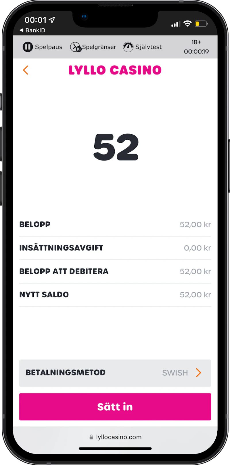 Du har nu valt din bonus, eller avsagt dig din bonus. Det är nu dags att sätta in pengar hos Lyllo Casino. Välj summa (minst 52 kronor) och klicka sätt in. Du kan välja mellan att ''swisha'' in dina pengar, eller föra över pengarna genom Trustly. Två insättningsmetoder som är säkra och smidiga.